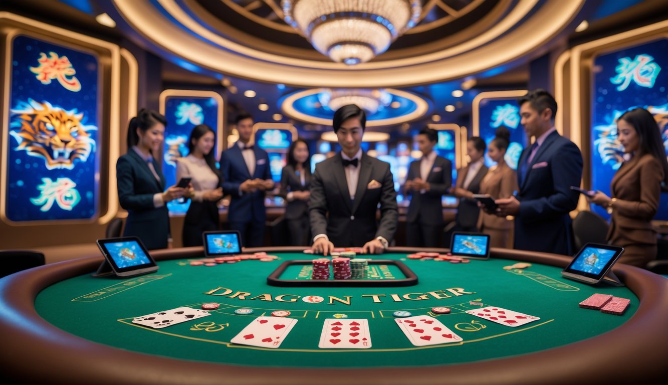 Suasana meja kasino langsung dengan pemain menggunakan tablet dan smartphone untuk bermain Dragon Tiger online.